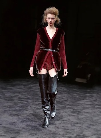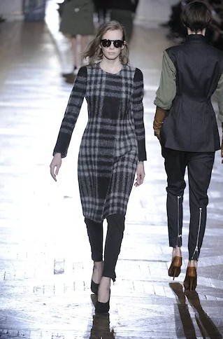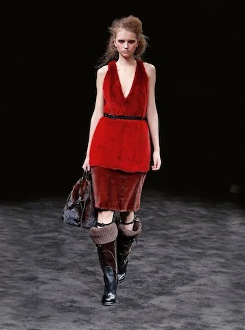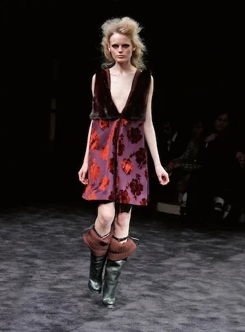 Лейтмотив моды 40-х — это перешивание, перелицовывывание того, что осталось от мирной жизни, а потом и военной формы. Платье из занавески, юбка из скатерти, жакет из мужского пиджака, кофта из дедушкиного пуловера. В коллекции Prada «осень-зима 2009», одной из лучших на эту тему в ее карьере, Прада использует жесткие мужские силуэты пиджаков и пальто, обрезая их и перетягивая ремнем,— вполне в духе 40-х, но при этом сделает их из кожи и норки, то есть материалов, откровенно представляющих роскошь, а вовсе не имитирующих бедность. Она оденет моделей в короткие пальто с жесткими плечами и стянутой талией, дополнив лук охотничьими сапогами с носками толстой вязки. К длинным трикотажным кофтам на пуговицах и суконным шортам с высокой талией — высоченные сапоги рыболова, пристегнутые ремешками к поясу. Сделает платья из двух частей — верх как будто из бархатной шторы, а низ из старой шерстяной юбки, или низ из как будто бы жаккардовой скатерти, а верх из неподдельной норки. Вместе со своими любимыми сиротскими шерстяными сарафанчиками выпустит на подиум норковый костюм из юбки и топа на бретельках. Серо-бурая гамма будет изредка перебиваться красным или коричнево-оранжевым, но в целом атмосфера останется вполне суровой. Ее девушки, с прическами в стиле 40-х, будут выглядеть как героини «Бесславных ублюдков», вышедших как раз поздней весной 2009 года, но немного и как персонажи экшенов про постапокалипсис и конец цивилизации.