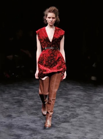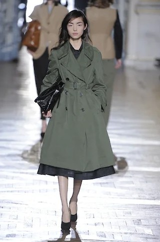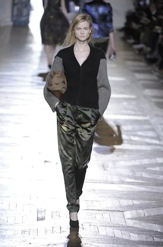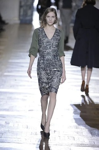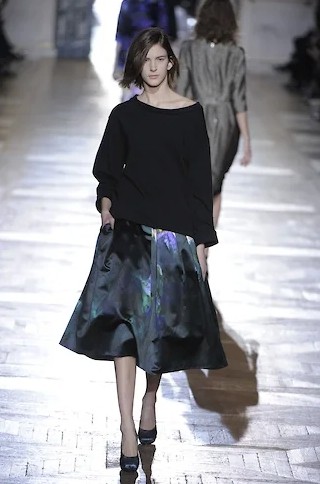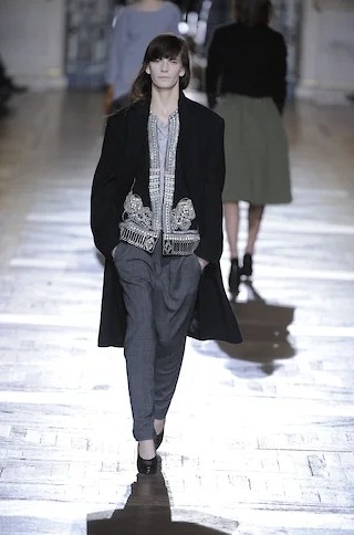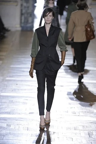 Коллекция Дриса Ван Нотена FW 2010 года выглядит далекой от стилизации 40-х. Но между тем с первых луков — запахнутых и стянутых на талии пальто и пиджаков с широкими мужскими плечами, похожими как раз на перешитое мужское, вспоминается именно эта декада. Дрис Ван Нотен при этом по большей части соединяет какие-то элементы той эпохи с совершенно современными — например, узкие брюки с низкой посадкой и жилет, напоминающий мужской пиджак, от которого просто отпороли рукава и сделали защипы, чтобы обозначить талию. В коллекции много аккуратных коротких жакетов, есть пальто-трапеции до колена и пышные юбки, много высоких кожаных перчаток в самых разных комбинациях, и это уже такие послевоенные 40-е. Вот-вот появится new look.