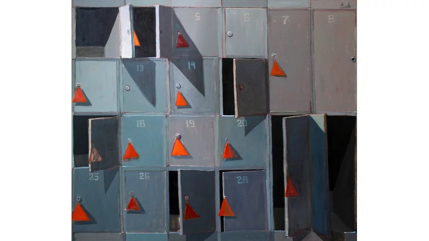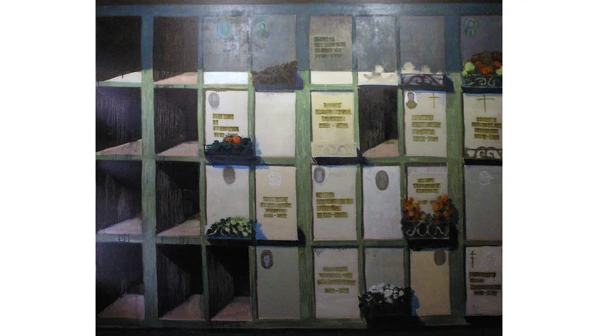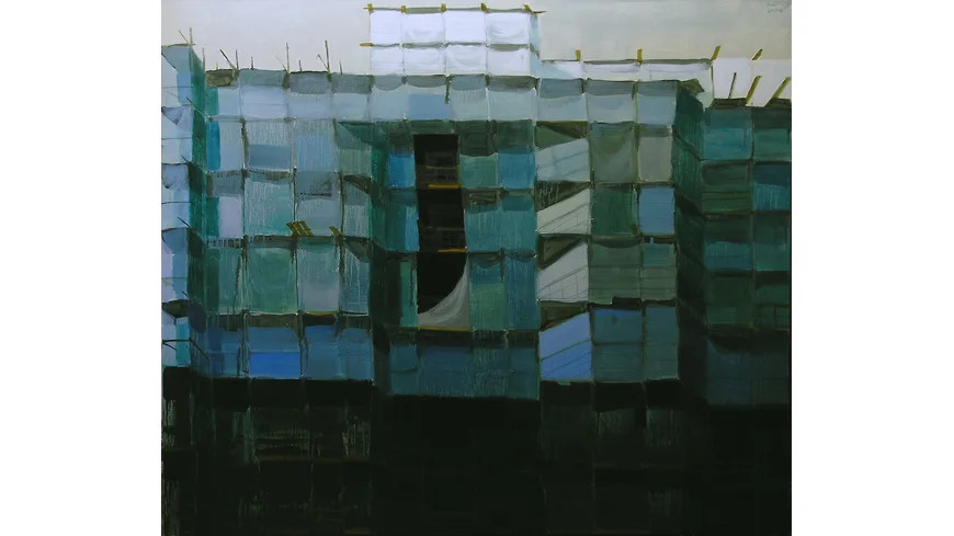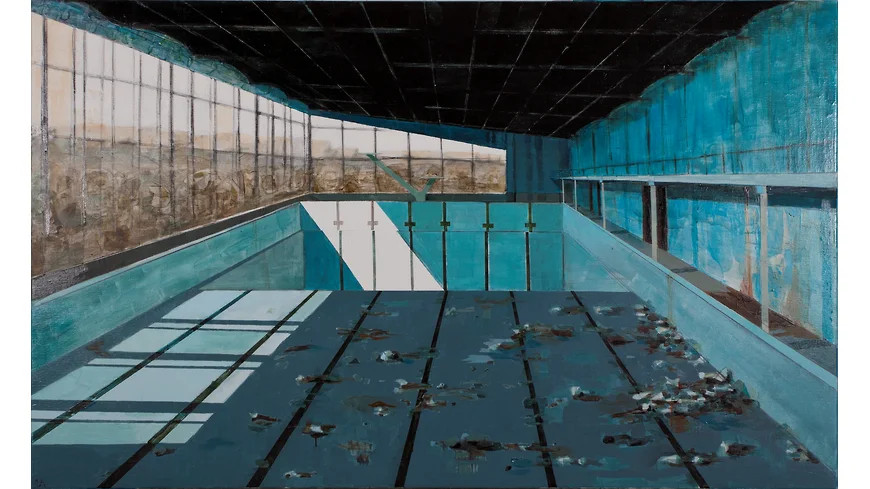 В 2000-е эта живопись вела себя прилично, притворяясь девушкой из хорошей семьи. Проявляла большое внимание к городским фактурам, особенно — к вторичному модернизму спальных окраин, мало кем тогда замеченному: к ритмам панельно-блочных структур, к кафельной плитке на стенах и сплошному остеклению фасадов, к конгломератам почтовых ящиков, кондиционеров и спутниковых тарелок, к уходящим в бесконечность перспективам бассейнов и станций метро. Знала свое место в рамках прямоугольного холста, который, как известно, является окном в мир, а если и позволяла себе вольности в виде тондо, так ведь окна могут принимать форму иллюминаторов. Семья действительно была на хорошем счету: у Дашевского, экономиста по первому и искусствоведа по второму образованию, нет диплома художника — живописи он учился приватно, у Михаила Иванова, ветерана ленинградского художественного и поэтического андерграунда, в молодости близкого к Владимиру Стерлигову, Павлу Басманову и арефьевцам, а позднее — к митькам. Первые выставки Дашевского и прошли у митьков — в квартирной галерее «Митьки-ВХУТЕМАС», к тому же в середине 2000-х он входил в «Общество любителей живописи и рисования», возникшее на перекрестке митьковства и «новых художников». Так что со временем его даже стали воспринимать как наследника Владимира Шинкарева, которому передалось это волшебное шинкаревское умение сотворять глубину и атмосферу как будто бы из ничего, с помощью одних лишь широких цветовых плоскостей. Только сквозь фирменную мрачность колорита у наследника всего лучшего в ленинградской школе то и дело проступала какая-то нездешняя синева с зеленью, вызывающая в памяти американцев — то ли Ричарда Дибенкорна (первая выставка Дашевского в модной галерее Anna Nova так и называлась — «Дибенкорн в Пулково»), то ли Эллсворта Келли (и его любимый прием — превращать в картину, балансирующую между реализмом и абстракцией, «найденную геометрию» каменной кладки или оконного переплета). Но Дашевский, экономист по первому и искусствовед по второму образованию, не мог не понимать, что ему — с его свежо звучащей урбанистической поэзией, колористическим дарованием и наследством ленинградской школы — гарантировано место первой кисти среди сверстников в локальной истории искусства, правда, со всеми причитающимися обременениями — от намеков на несовременность живописи как таковой до упреков в галерейно-коммерческом товарном лоске. И ему пришлось изобретать и себя как художника, и свое искусство заново.