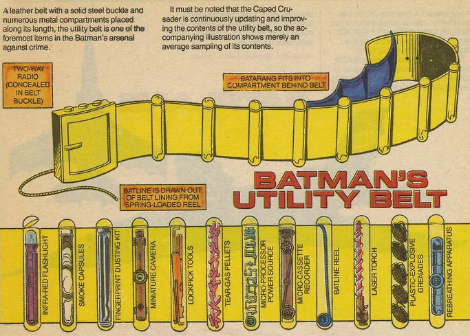 У Бэтмена около 500 разных гаджетов для борьбы с преступниками. Отсутствие сверхспособностей Бэтмен компенсирует великолепной технической оснащенностью. Летать он может благодаря уникальной конструкции плаща — попадая под встречный поток воздуха, он становится жестким и позволяет своему хозяину планировать. Плюс на поясе у него куча гаджетов, их количество неизменно росло от комикса к комиксу и от фильма к фильму. В разные моменты там обнаруживались: лазер, дротики с транквилизатором, бэтаранги, лассо, шарики с клеем, взрывчаткой и едким газом, отмычки, миниатюрная химическая лаборатория, надувные ботинки, позволяющие ходить по воде, ультразвуковое оружие и т. д.
