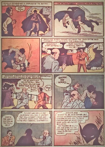 Первый комикс про Бэтмена — плагиат. Бэтмен впервые появился в альманахе Detective Comics в мае 1939 года в комиксе «Дело о Химическом синдикате», в котором он расследовал убийство директора химзавода и выяснял, что его убил партнер по бизнесу, а затем отправлял преступника в чан с кислотой. Точно такую же историю описывал Теодор Тинсли в pulp-рассказе о супергерое Тени «Партнеры в опасности» в ноябре 1936 года — только его герой не устраивал самосуд, а сдавал преступника властям. Комикс про Бэтмена повторял не только сюжет рассказа Тинсли, но и элементы иллюстраций к нему.
