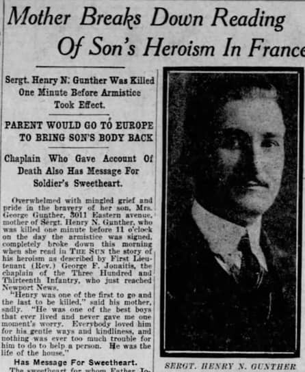 Последний погибший в боях Первой мировой войны: Генри Гюнтер