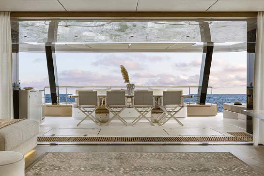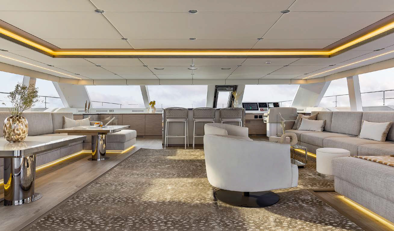 Салон на главной палубе также отличается впечатляющим пространством, которое обеспечивает катамаранная конструкция судна. Панорамные окна дают в помещении превосходную освещенность (и прекрасные морские виды). По бортам стоят большие диваны, есть кресла, еще один бар и пост управления судном справа. Рядом с ним находится дверь, через которую можно выйти на носовую палубу-террасу. Там организована еще одна зона отдыха с диванами, лежаком-«солярием» и бассейном.