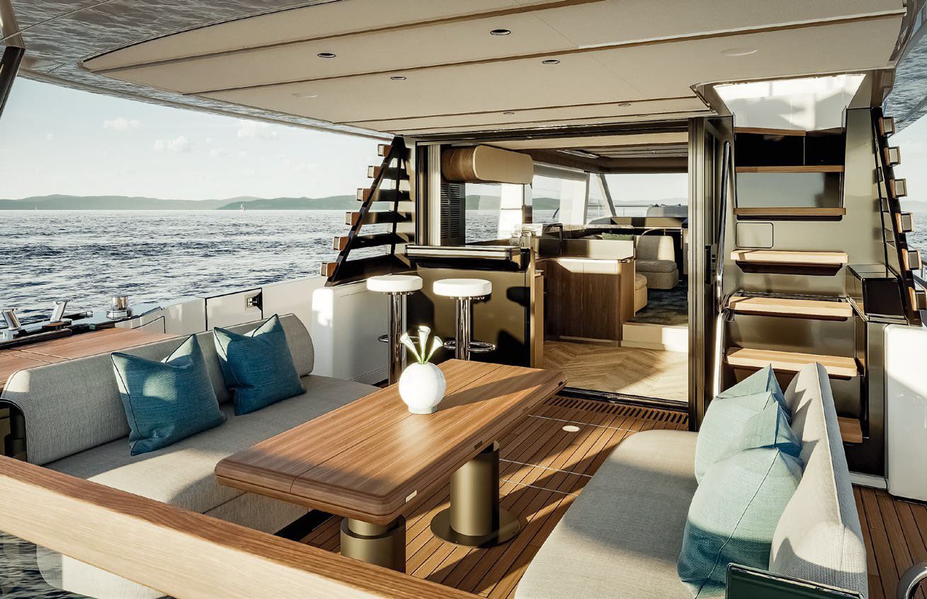 На фордеке — диваны и лежак для загорания с перекидной спинкой. Кокпит в корме просторный; здесь тоже стоят два дивана визави со столом между ними. Стол можно поднять и разложить, превратив эту «террасу» в уютную обеденную зону в тени длинного свеса флайбриджа. В кокпите еще примечательны прозрачный фальшборт на транце и стойка бара с высокими стульями на левом борту (бар является продолжением камбуза). А также двери в салон: они не сдвижные, как на многих яхтах, а складные. За кокпитом находятся большая гидравлическая купальная платформа и телескопический трап, тоже на гидравлике.