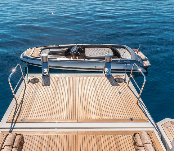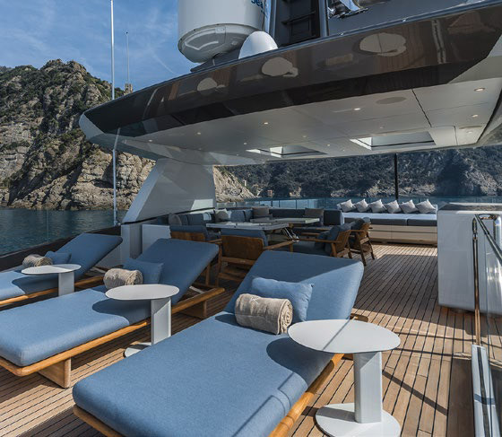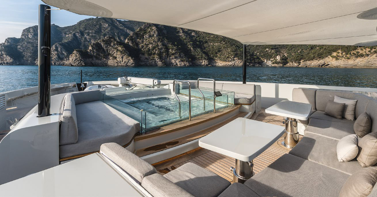 Например, одно из основных отличий Kinda от ее предшественниц состоит в том, что джакузи «переехало» с сандека на носовую палубу, где превратилось в практически полноценный пятикубовый бассейн с прозрачными стеклянными бортиками. Конечно, плаванием в нем не займешься, но поплескаться втроем или даже вчетвером вполне возможно. С двух сторон чашу бассейна обрамляют лежаки, а под лобовыми стеклами ходовой рубки расположен подковообразный диван со столиками под коктейли и закуски. Кто‑то заметит, что подобная планировка не способствует приватности купающихся (у вахтенного вряд ли получится постоянно отводить взор!), однако заказчик решил, что для него это не такой уж серьезный компромисс.