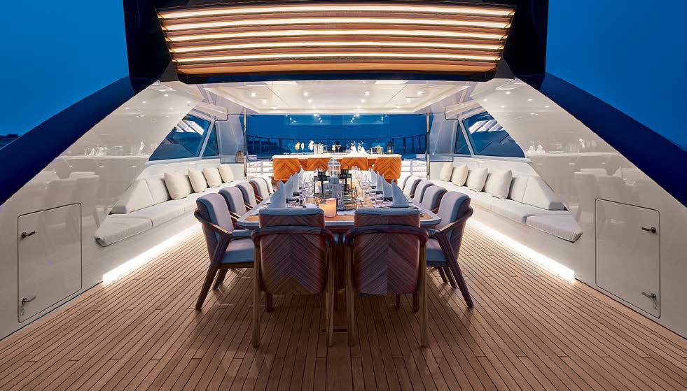 За счет чуть большей длины судна просторнее стал и флайбридж. При этом на верфи решили не менять его принципиальную планировку. Плюс в том, что флайбридж не загроможден мебелью и прекрасно подходит для вечеринок с массой гостей. Команда может довольно быстро накрыть джакузи помостом, убрать шезлонги и тренажеры, подготовить место для музыкантов и сервировать стол легкими закусками. При этом по обоим бортам сохраняются подходы к бару, гости могут свободно циркулировать по палубе и отдыхать с напитками на длинных диванах под хардтопом. В стандартном варианте какое‑либо остекление на флайбридже отсутствует, однако владелец Come Together попросил закрыть от ветра бортовые проемы и установить почти незаметные сдвижные стеклянные экраны между баром и джакузи. Внешний вид яхты от этого не пострадал, тогда как обеденную зону надежно защитили от ветра. Кстати, это не очевидно, но подиум носовой части флайбриджа может служить простой взлетно-посадочной площадкой для вертолета при условии, что яхта используется частным образом. Достаточно убрать мебель, завалить релинг — и вот вам touch & go.