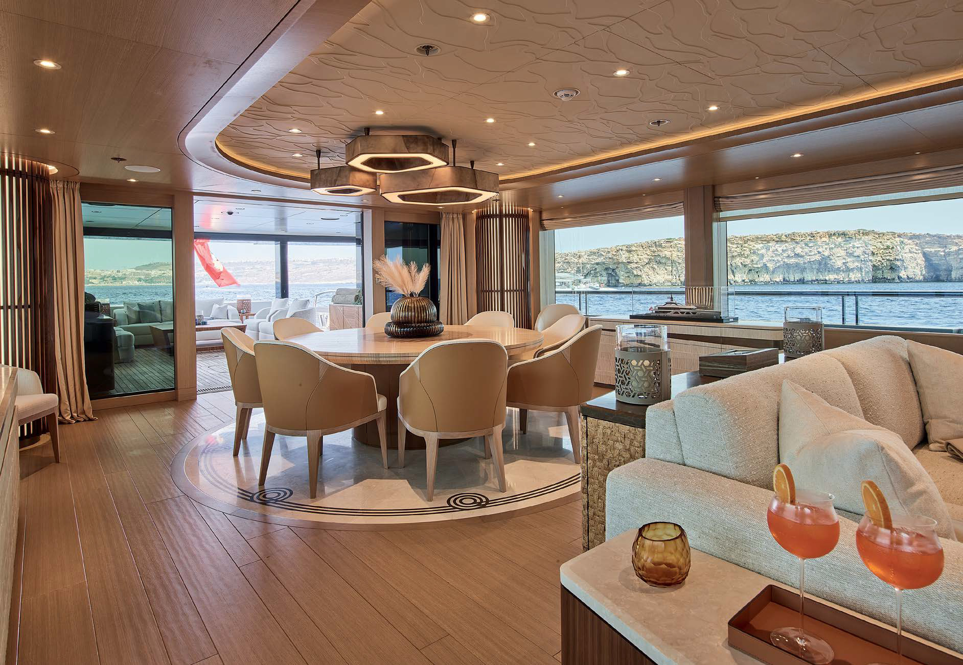 Планировка верхней палубы тоже свидетельствует о том, что Amels 60 — прямая преемница успешной Amels 180. В ее открытой кормовой части расположена еще одна обеденная зона с небольшим столом на восемь персон, баром и диванчиками, куда можно отправить непоседливых детей или после сытной трапезы отвалиться самому. Когда яхта была уже почти достроена, и сюда добавили ветрозащитные экраны, чтобы гости не мерзли, а салфетки не улетали за борт.