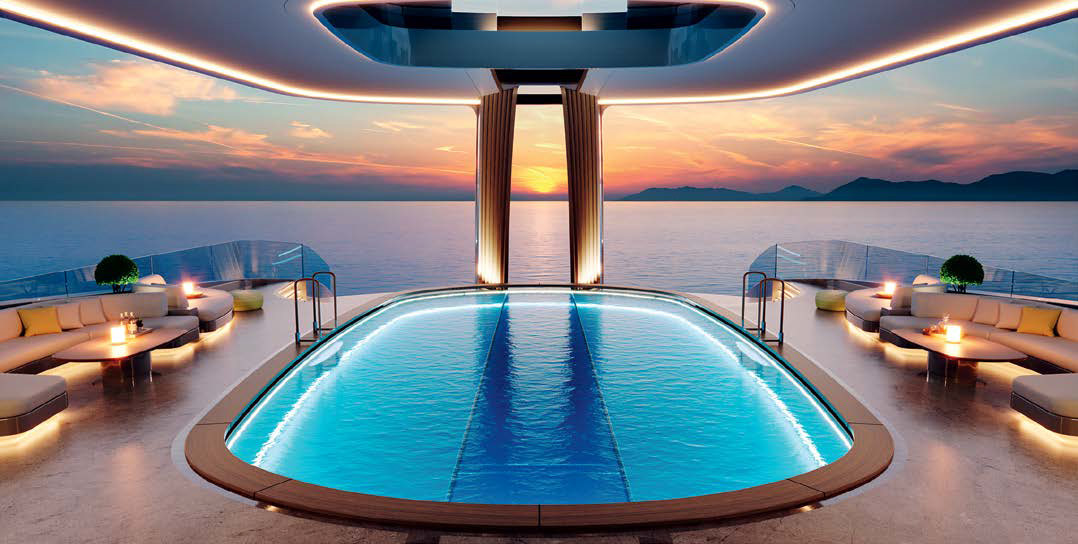 Прежде всего воображение поражает центральный атриум высотой в три палубы (12,5 м). Мне доводилось бывать на крупных лодках с подобными решениями, где от взгляда вверх захватывает дух, но даже по визуализации ясно, что атриум Slice площадью 70 кв. м будет масштабнее и зрелищнее. Попробуйте представить, что вы стоите внизу у диковинных скульптурных композиций и смотрите на уходящую к небу многометровую люстру тонкой работы, над которой проплывают облака… Кажется, на яхтах такого еще не бывало! Кстати, в верхнюю полосу остекления Feadship обещает интегрировать солнечные панели и возможность электрического затемнения по нажатию кнопки.