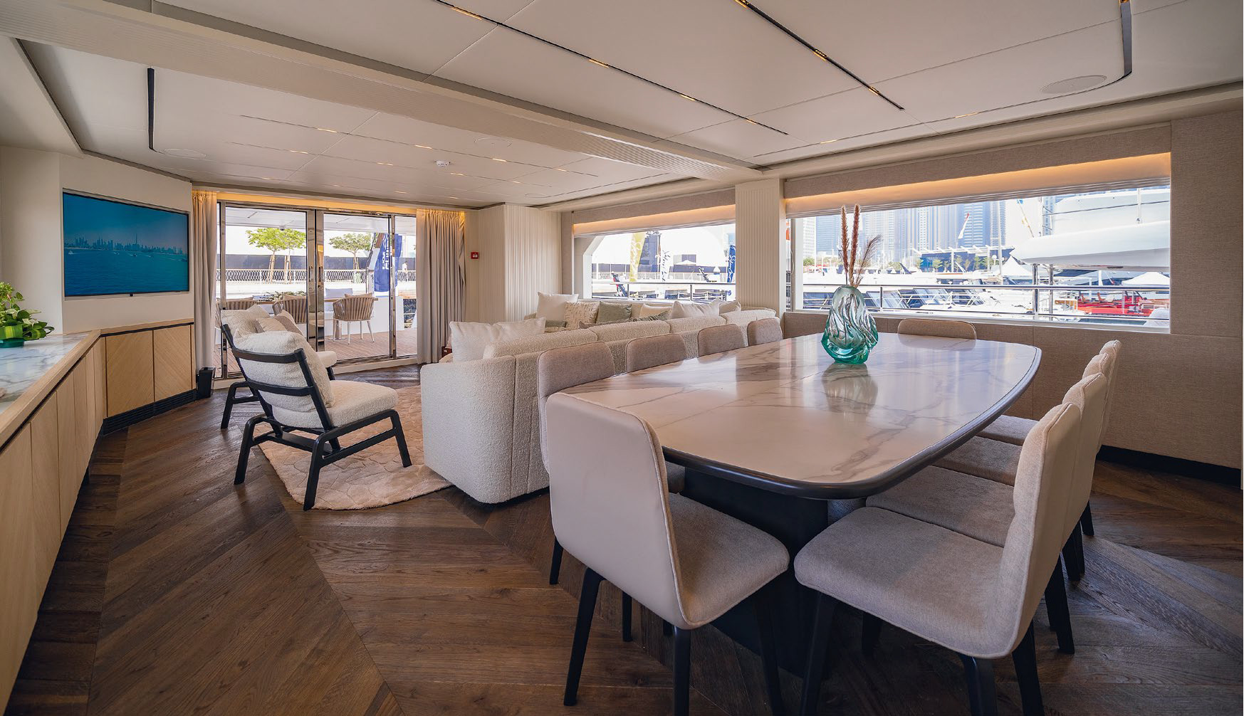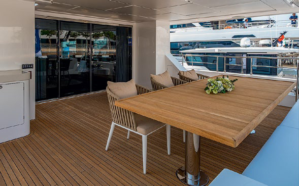 У яхты довольно свободные открытые участки покрытых тиком палуб. На фордеке стоит диванчик со столиком, и находящиеся там гости не помешают работе экипажа со швартовным и якорным устройствами (на палубе красуются два якорных шпиля). На главной палубе в корме видим большой диван вдоль транца и стол из деревянного массива под защитой свеса верхней палубы. Отметим обширное пространство и мощные швартовные лебедки по бортам. Спустившись отсюда на кормовую платформу, оказываешься в зоне, которую принято называть beach club. Транец яхты поднимается, открывая пространство, которое можно использовать как гараж для тендера Williams 325 Jet и двух аквабайков или только зону отдыха с диванами и креслами (если тендер, к примеру, держать на платформе).