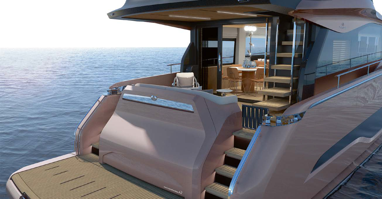 Кокпит демонстрирует обязательный диван на транце, по обеим сторонам которого несколько ступенек ведут к большой купальной платформе, оборудованной электроприводом. «Пляжную» зону можно расширить, подняв дверь обустроенного под диваном гаража: пайол из тикового дерева внутри выглядит продолжением платформы. А в дверь гаража встроены душ и стереодинамики. Внутри поместятся тендер длиной 2,85 м и Seabob в вертикальном положении или гидроцикл и два подводных буксировщика. При необходимости на платформе можно держать еще один тендер/аквабайк.