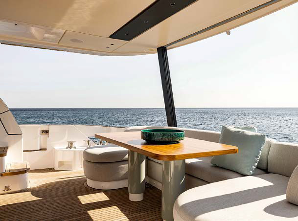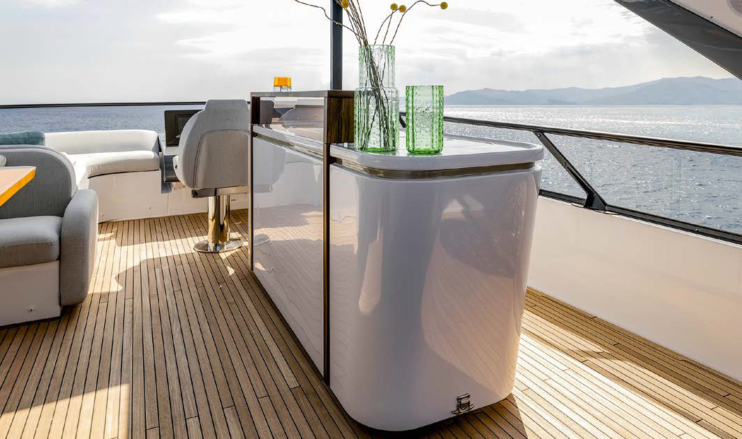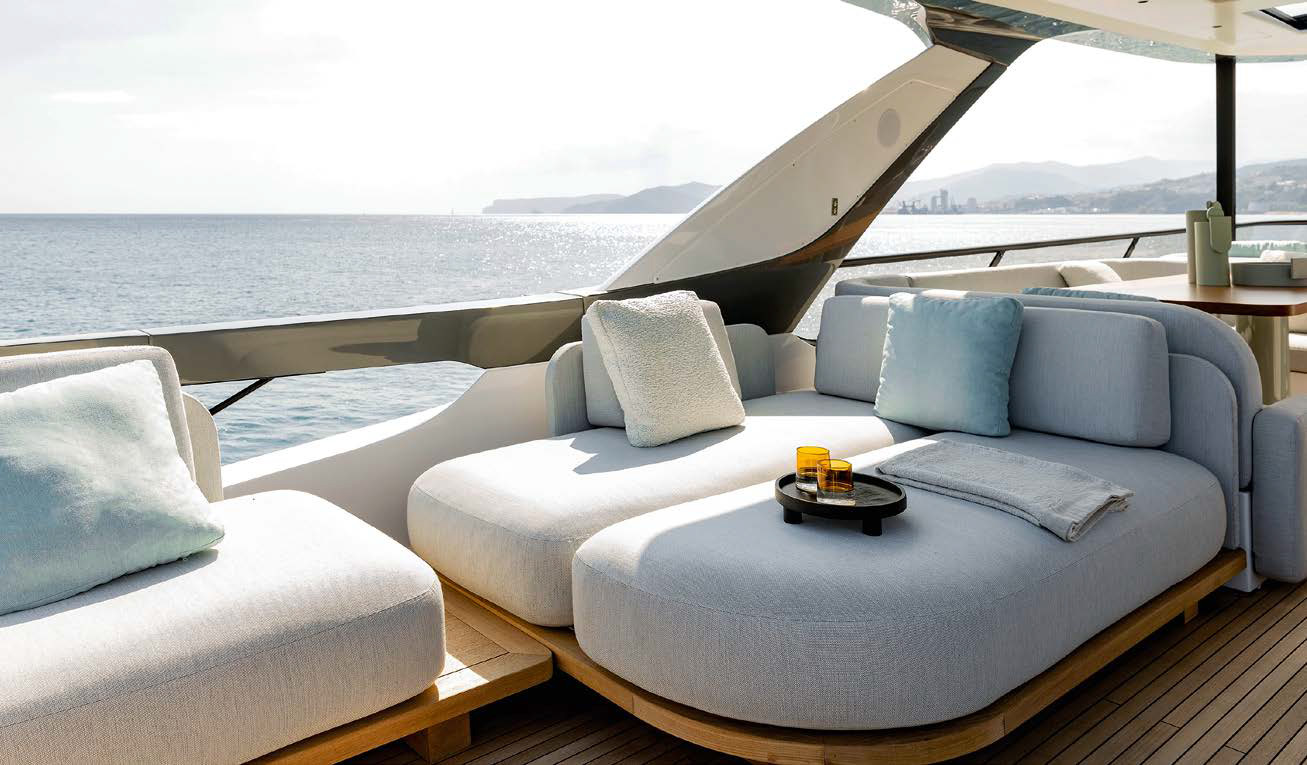 У этой открытой палубы знакомая компоновка — тут сложно что‑либо изобрести. Тем не менее в деталях немало новшеств, и это выглядит как серьезная заявка дизайнера. Еще Микеланджело Буонарроти заметил, что внимание к мелочам рождает совершенство, а вот совершенство — это уже не мелочь. Изменилась конфигурация приборной панели поста управления (правый борт) с двумя мультифункциональными дисплеями Raymarine и дисплеями MAN, форма «солярия» и С-образной динетты с тиковым столом (левый борт) под прозрачным хардтопом с люком. Другим стал ветбар с холодильником: его «оторвали» от борта, теперь им удобнее пользоваться, плюс он получил опцию в виде ТВ-экрана с системой лифта. Лежаки в корме смещены к левому борту, и здесь должно хватить пространства для тендера с габаритами 3,3 × 1,7 м.