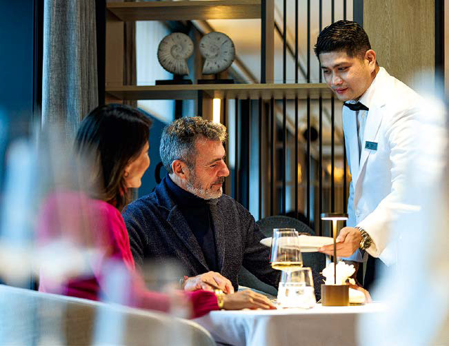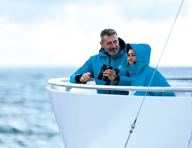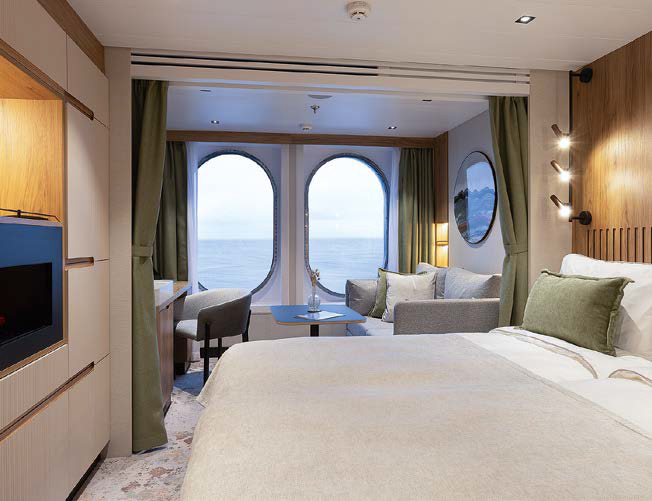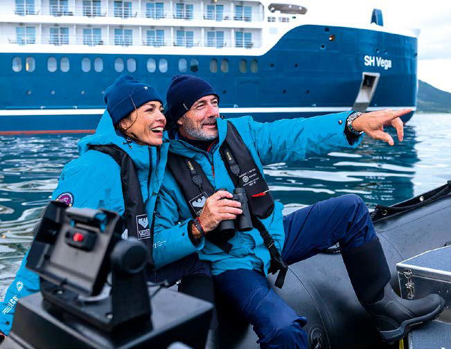 Во флоте Swan Hellenic есть несколько лайнеров, или, как их в компании справедливо называют, роскошных суперъяхт, регулярно совершающих рейсы в Арктику, Антарктику, по фьордам Норвегии и вдоль берегов Исландии. Среди них SH Vega и флагман флота — SH Diana. Это суда тяжелого ледового класса, на которых будет комфортно идти в битом льду толщиной до метра. На 115-метровом девятипалубном лайнере SH Vega в 76 каютах могут разместиться 152 гостя, а на 125-метровом SH Diana уже 192 в 96 каютах. На каждом судне членов экипажа почти вдвое больше, чем гостей. Каюты просторные, с большими окнами, некоторые даже с балконами. Есть и шикарные люксы для тех, кто привык к обстановке суперъяхты, а также подогреваемый бассейн и спа-комплекс с сауной. Все общие помещения на борту: салоны, ресторан (к слову, высокой кухни), библиотека — воплощение стиля хюгге. Уютные кресла, мягкие ткани, толстые ковры, современные камины в стекле — именно такой обстановки хочется, когда за бортом постепенно