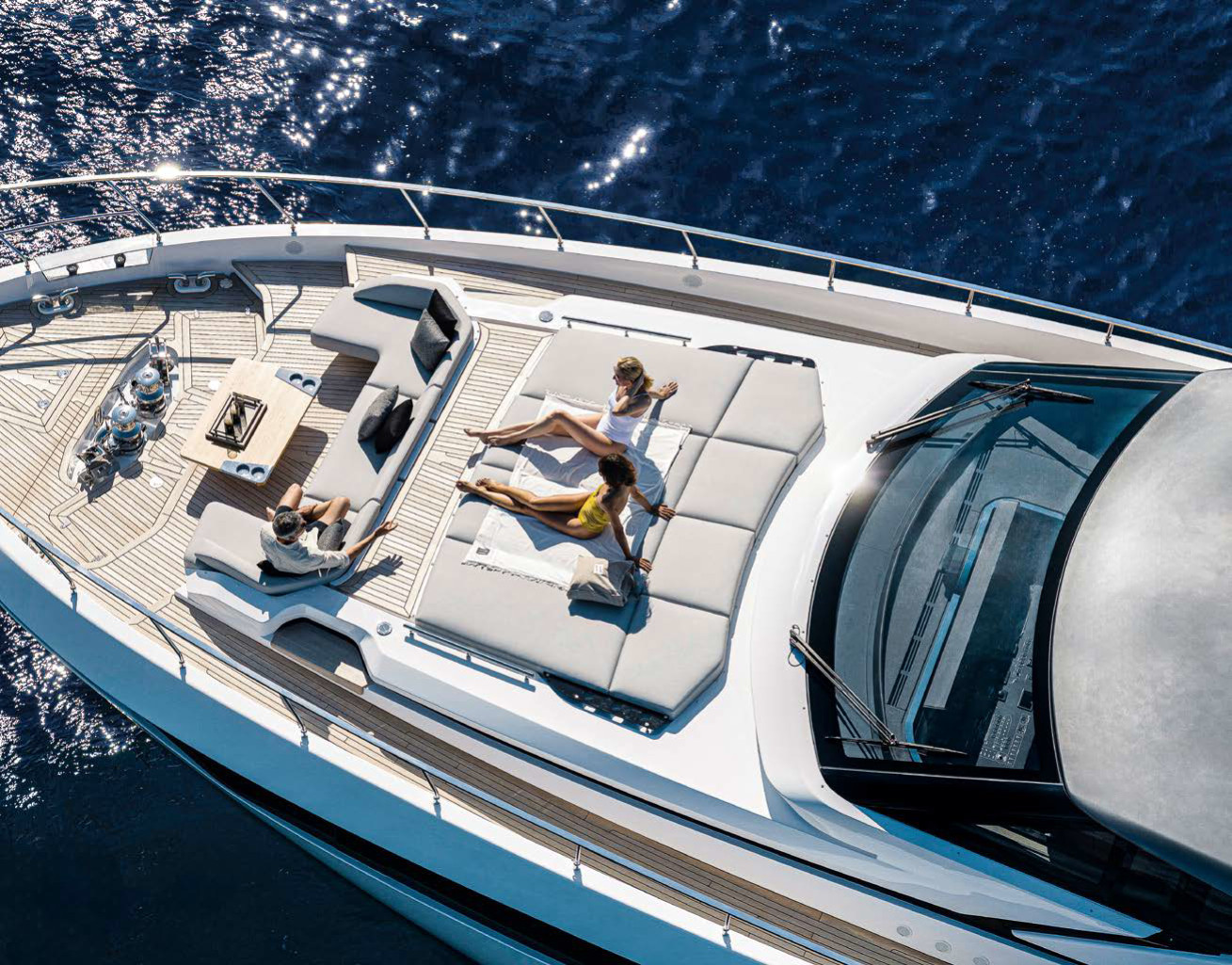 На флайбридж площадью 50 кв. м ведут два трапа: наружный (из кокпита) и внутренний (из ходовой рубки). Часть палубы защищена хардтопом на изящных опорах с опцией в виде жалюзийной вставки. Под ним находятся пост управления, зона для трапезы на воздухе и практичный ветбар с барной стойкой. Палубу в корме можно персонализировать для максимального комфорта с помощью отдельно стоящей мебели — шезлонгов Talenti или низких столиков Minotti (как на первом корпусе).