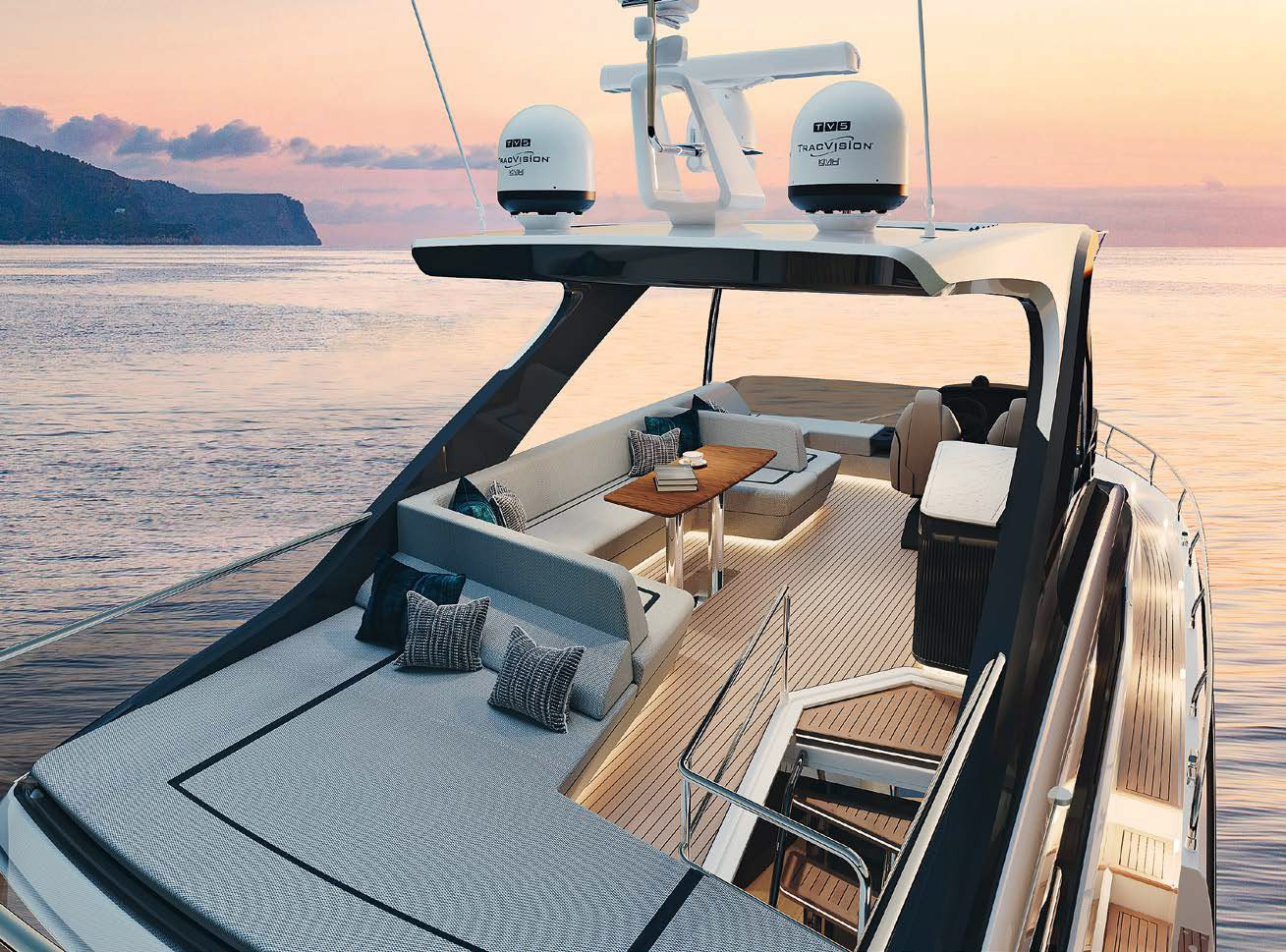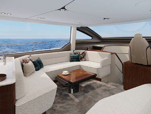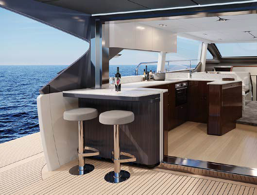 Итак, чем примечательна новинка? Еще издали ее будут выделять модерновый силуэт, обильное бортовое остекление, дающее высокую освещенность внутри, и хардтоп на наклонных S-образных опорах (похожие я видел у нескольких европейских брендов). Мгновенно узнаваемой деталью являются три характерных «плавника», украшающих боковую поверхность надстройки. По-новому решена компоновка открытых зон. Компактный, но вовсе не тесный флайбридж (у других брендов открытая палуба такого формата называется Sportbridge) довольно плотно заставлен «мебелью»: помимо рулевой консоли, там поместились динетта, бар и лежаки для загорания в кормовой части, обнесенной прозрачным защитным ограждением. Фордек с диваном и «солярием» удивления не вызывает, а вот главная палуба в корме интересная. «Традиционалисты» могут выбрать обычную компоновку кокпита (сверху он частично защищен свесом флайбриджа) с диваном и столом на транце, фиксированную или опускаемую платформу, достаточно большую, чтобы вместить водометный тендер Williams 345.