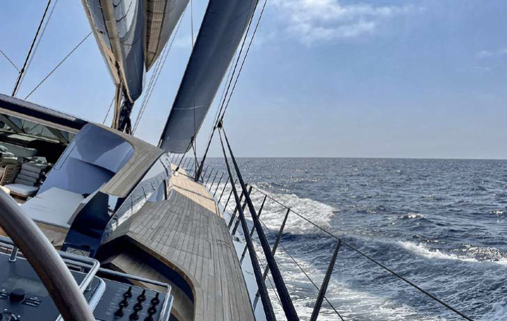 Открытая планировка кокпита выполнена практически в одной плоскости, как у моторных яхт. В кокпите, который может накрываться большим тентом, владельцу и гостям комфортно отдыхать и обедать. Транец откидывается, образуя большой (20 кв. м) «пляжный клуб» с баром и сауной. Откидные платформы по бортам обеспечивают безопасный доступ на борт, к воде или тендерам. Зона фордека может похвастаться такими элементами, как джакузи и… стенка-скалодром на внутренней стороне двери гаража для тендера.