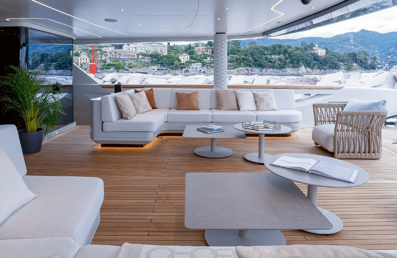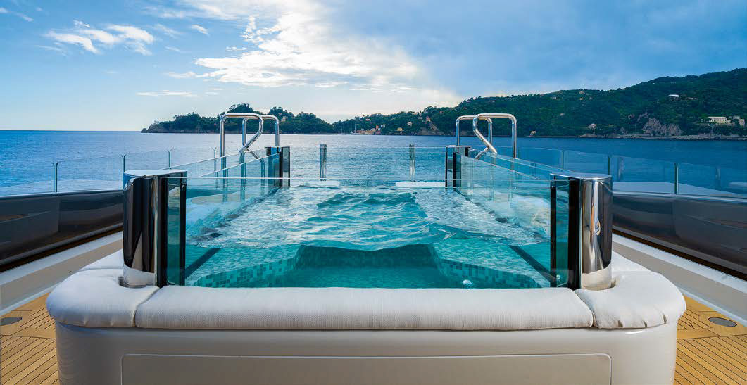 Перед Пашковски стояла задача создать элегантную, сбалансированную яхту с корпусом из стали и надстройкой из легкого сплава, без доминирующих элементов типа огромного «пляжного клуба» в корме, и при этом никак нельзя было предложить результат, который бы назвали несовременным. Ну какая теперь яхта 50+ м без хорошо оборудованного места для отдыха у воды и купания? Как же то самое чувство моря, о котором мы постоянно слышим последние несколько лет? Дизайнер нашел прекрасный выход: у T52 трехуровневый «пляжный клуб», который складывается из откидной купальной платформы, двух массивных лежаков со столиком между ними и из бассейна. Откачав воду, его можно накрыть и превратить в часть зоны отдыха в кокпите (главная палуба). Так получилась аккуратная и при этом