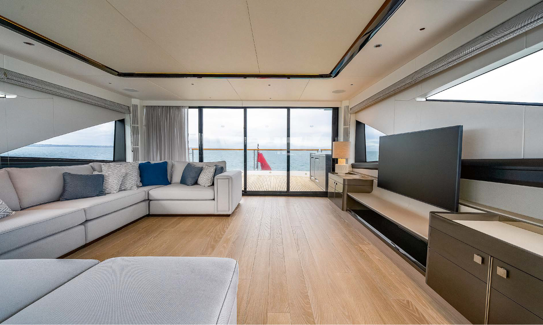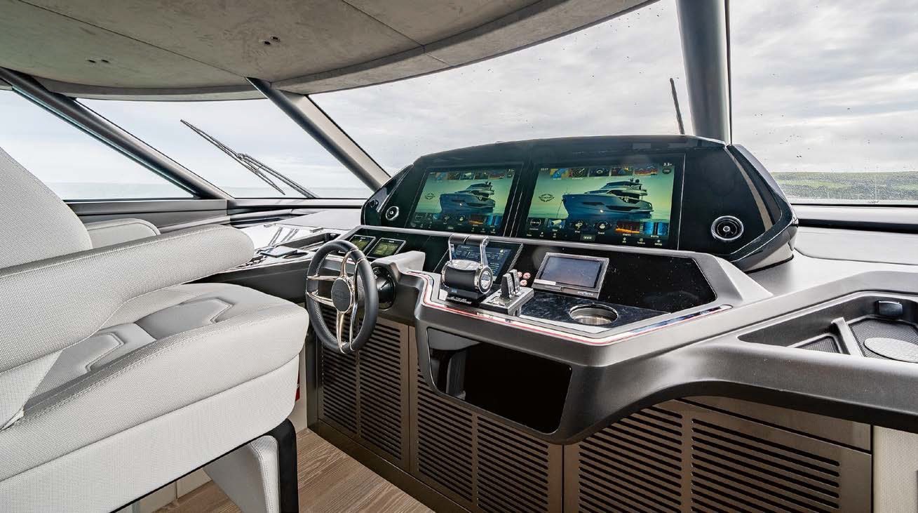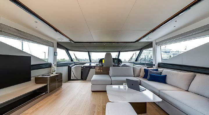 Такой «пентхаус» с обширным панорамным остеклением, помимо конфиденциальности, обеспечивает повышенный комфорт, поскольку наличие там климат-контроля позволяет эксплуатировать яхту в акваториях и с жарким, и с холодным климатом. Для определенной части заказчиков это выглядит большим плюсом по сравнению с открытой палубой. В качестве опций предлагаются пайол из тикового дерева и люк в крыше во всю ширину флайбриджа.