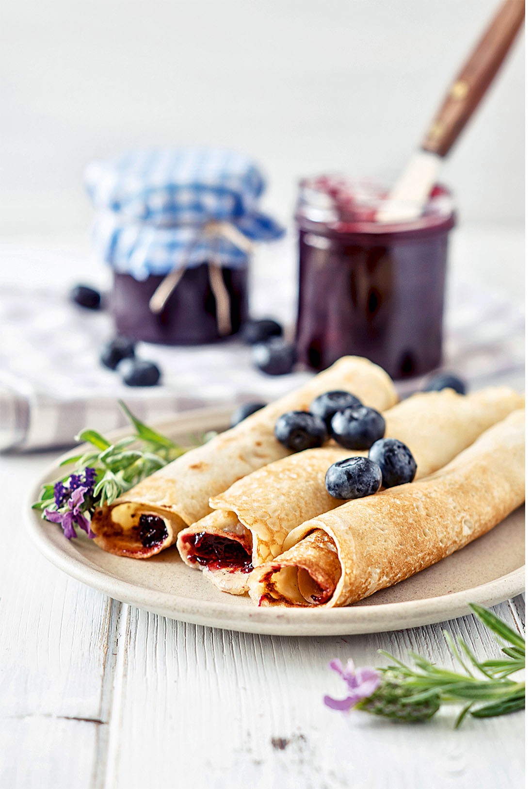 К солёным блинам хорошо подойдут грибная или кабачковая икра домашнего приготовления, тофу с зеленью, ореховая паста, перетёртая с чесноком и травами, или тушёные овощи со специями. В сладкие блины можно завернуть размельчённые сухофрукты, ягоды, пасту из изюма и орехов, печёные фрукты. Сверху можно полить их малиновым соусом или посыпать тёртым шоколадом.