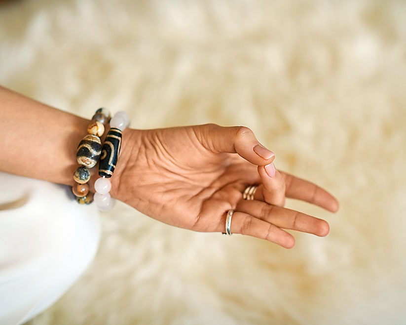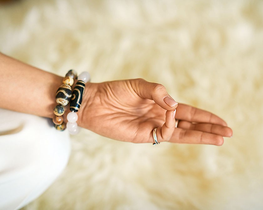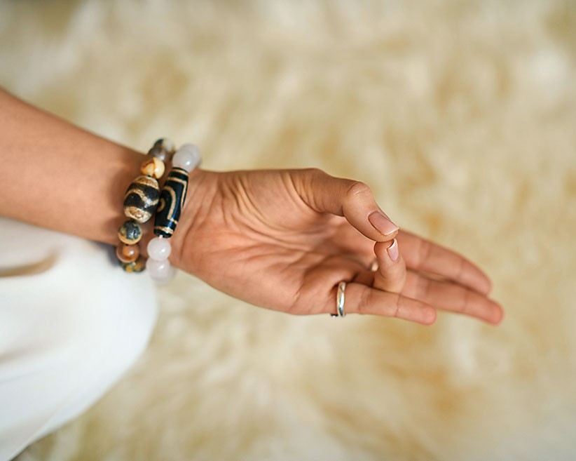 МУДРА: руки выпрямлены в локтях, кисти рук на коленях, ладонями вверх. На каждый слог — своя мудра, последовательно соединяем кончик большого пальца с указательным, средним, безымянным пальцами и мизинцем с достаточно сильным нажатием.