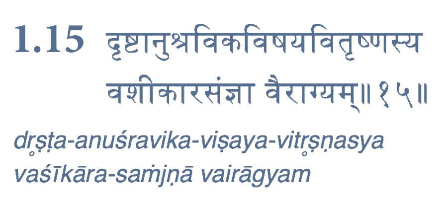 «Йога-Сутрах» Патанджали называет абхьясу (практику) и вайрагью (бесстрастность, отсутствие тяги к объектам удовольствия) двумя необходимыми элементами йоги. В сутре 1.15 он более подробно поясняет, что же значит «бесстрастность».