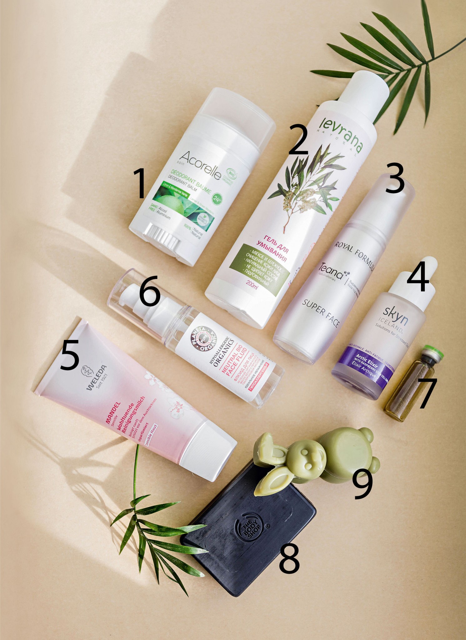 1. Дезодорант-бальзам «Лимон и зелёный мандарин», Acorelle. 2. Гидрофильный гель «Чайное дерево» для умывания кожи лица, Levrana Natural. 3. Выравнивающя база под макияж Superface, Teana Laboratories. 4. Сыворотка для лица Arctic Elixir, Skyn Iceland. 5. Деликатное очищающее молочко «Миндаль», Weleda. 6. Флюид для лица, Planeta Organica. 7. Биоэссенции для кожи Vegenius, Teana Laboratories. 8. Очищающее мыло для лица «Гималайский уголь», The Body Shop. 9. Мыло в форме зайца «Оливки», The Body Shop.