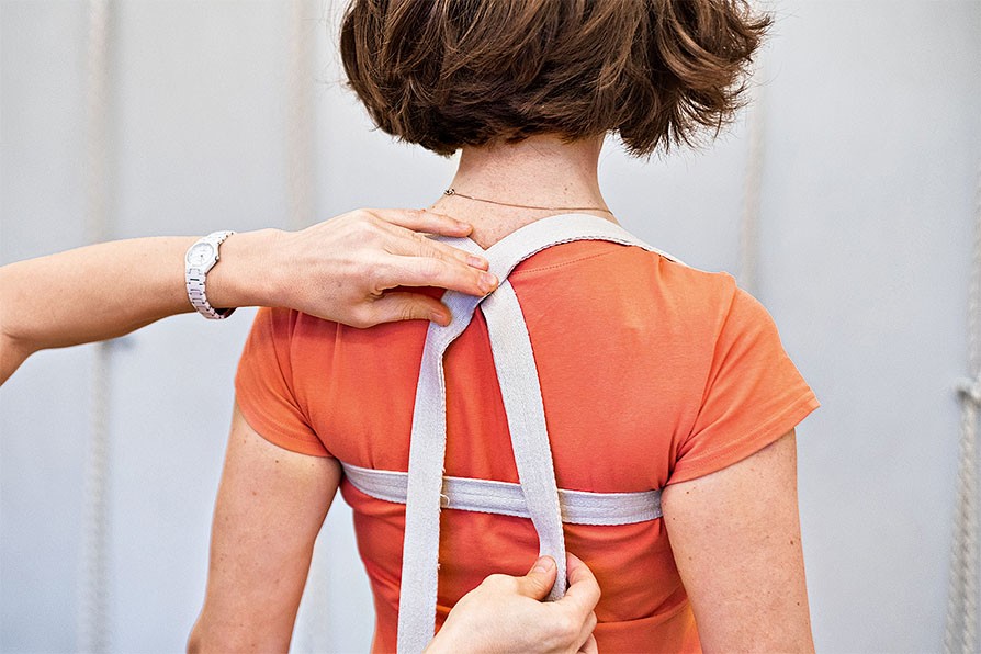 Разворот плеч изнутри наружу, направление трапециевидной мышцы от шеи, лопаток и грудного отдела позвоночника внутрь спины — ключевое движение, которое надо освоить при работе с проблемами шеи. Обучить мышцы рук и верха спины правильной работе можно, используя шлейку из ремня на плечи.