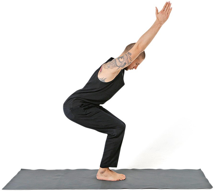 Стоим на коврике, ноги вместе. Прямые руки поднимаем над головой на ширине плеч, а плечи уводим вниз от шеи. В данном положении немного втягиваем пупок внутрь и фиксируем положение ровной поясницы. Затем медленно сгибаем ноги в коленях, так же как если бы мы садились на стул позади себя, корпусом немного наклоняясь вперед. Макушка направлена в сторону рук, а взгляд на пол перед собой. Удерживаем от 6 до 8 дыханий.