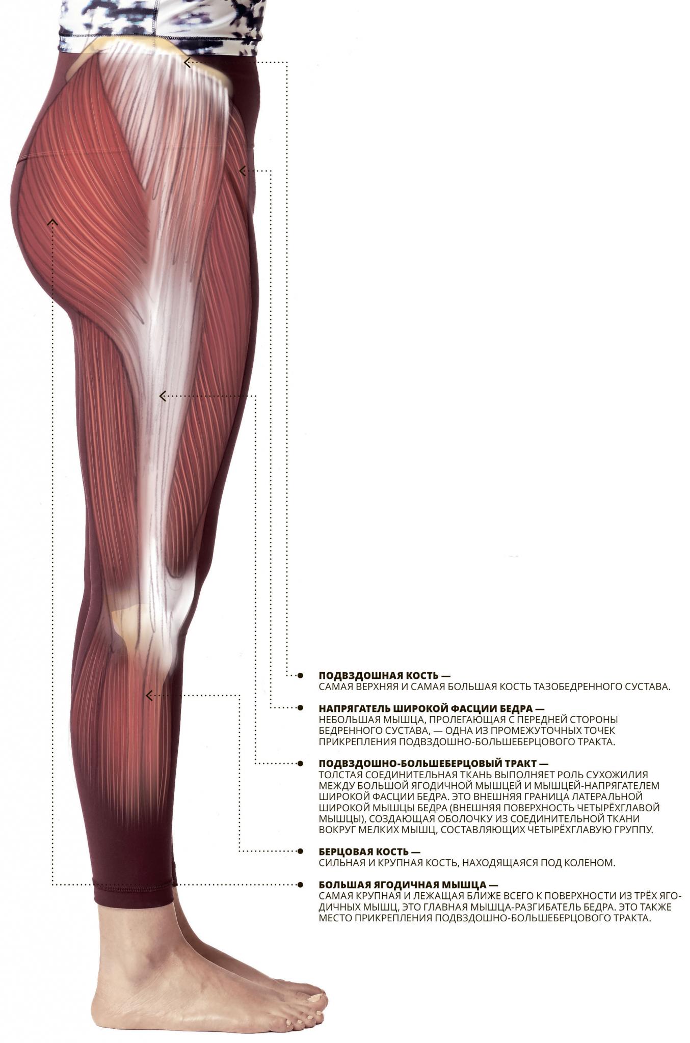 Подвздошно-большеберцовый тракт, скорее всего, не возглавляет список приоритетов большинства практикующих йогу. В конце концов, эту толстую фасцию трудно вывести из строя одной йогой. Однако если вы любите прыжки назад в Планку, или практикуете йогу как дополнение к более интенсивным кардио-тренировкам, скорее всего, вы можете почувствовать эту волокнистую структуру и заключить, что она является источником ощущения сжатости. Вы будете правы: ткани подвздошно-большеберцового тракта отличаются твёрдостью, которая служит естественной защитой внешней поверхности бедра. Если вы испытываете боль с внешней стороны колена, усиливающуюся при его сгибе, это может быть признаком того, что у вас синдром подвздошно-большеберцового тракта. Например, боль может настичь при подъёме или спуске по лестнице, или во время практики йоги в позах, требующих глубокого сгиба одного из колен, как в Вирабхадрасане II. Причина в том, что напряжение подвздошно-большеберцового тракта вызывается дисбалансом мышцы-напрягателем широкой фасции бедра и большой ягодичной мышцей, — двумя точками прикрепления подвздошно-большеберцового тракта к бедренному суставу. Когда эти мышцы тянут подвздошно-большеберцовый тракт, соединяющий коленную чашечку с внешней частью большеберцовой кости, вы можете испытать болевые ощущения с наружной стороны колена.