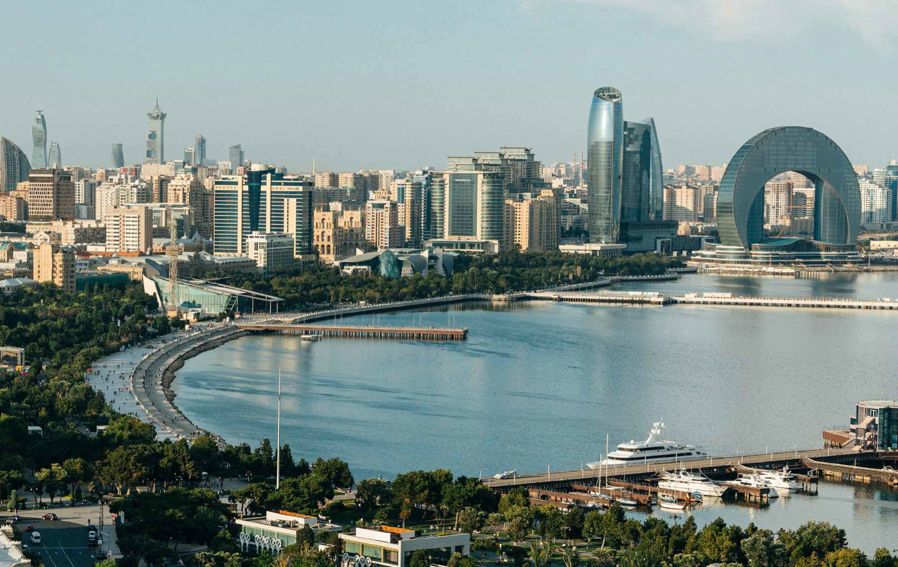 Современный Баку — город необычной архитектуры. Доминантой столицы можно назвать комплекс Flame Towers. Три здания в форме языков пламени полностью покрыты LED‑экранами, проекция ночью напоминает движение огня.