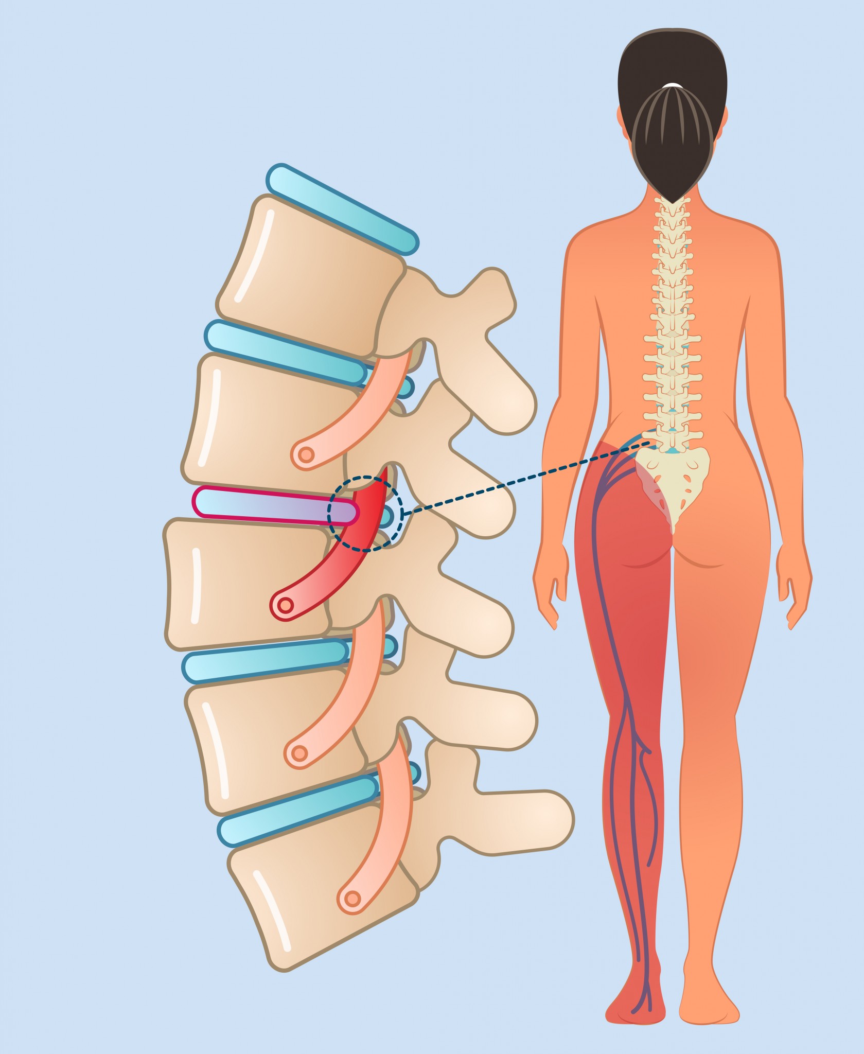 Проснулись утром, а встать на ногу не получается – сильная боль распространяется по ягодице и дальше по задней поверхности бедра, иногда достигая пятки. Зачастую мы не понимаем, в чём дело, и сильно пугаемся, но если восстановить последовательность событий недавнего прошлого, наверняка вспомнится, что буквально вчера носили тяжести, двигали шкаф или сидели на сквозняке. Оказывается, так проявляется обострение остеохондроза позвоночника, протрузии или грыжи межпозвонкового диска, которое раньше было принято называть радикулитом. Почему же болит нога?