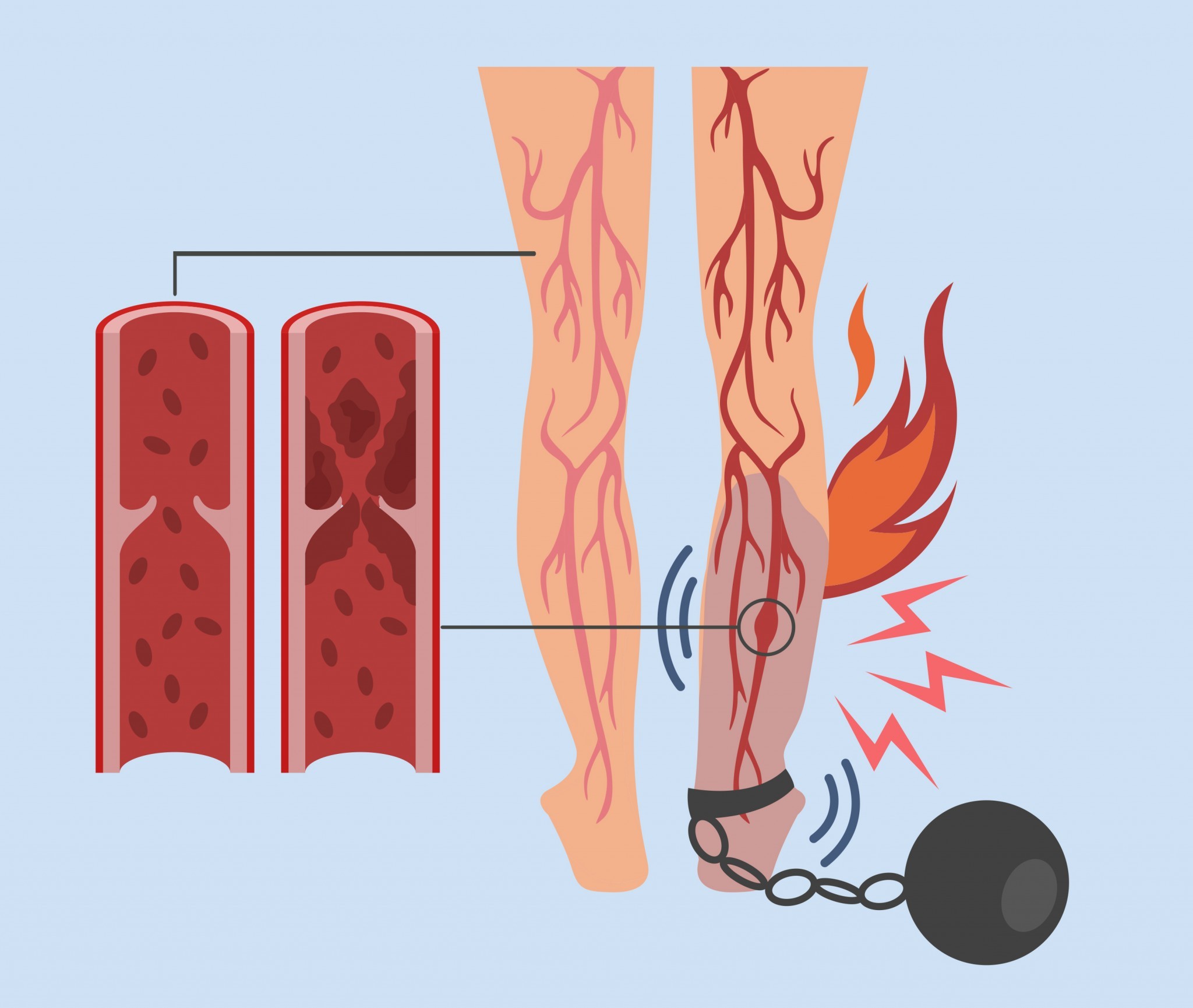Появление атеросклеротических бляшек в артериях ног вызывает ухудшение кровоснабжения мышц и их ишемию. По аналогии с сердечной мышцей и стенокардией, икроножные мышцы испытывают при повышении нагрузки сильную боль. Чаще всего она попеременно появляется то в одной, то в другой ноге, развивается так называемая перемежающаяся хромота. Болезнь прогрессирует и дистанция безболевой ходьбы постепенно снижается, а когда поражение сосудов станет особенно серьёзным, боль может беспокоить даже в покое. Облитерирующий атеросклероз – это мужская болезнь, в большинстве случаев ей страдают курильщики после пятидесяти.