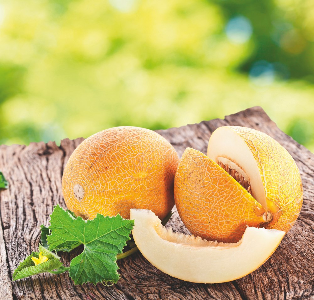 Основная часть мякоти дыни – вода, примерно 90%. Продукт низкокалорийный: в 100 г примерно 34–38 ккал в зависимости от сорта. Из витаминов в дыне больше всего бета-каротина, который придаёт фрукту жёлтый цвет, а нам полезен для зрения, кожи и сосудов.
