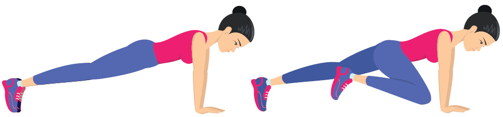 Основные движения: поддержание тела в планке и одновременное сгибание ног. Опуститесь на пол с опорой на руки и колени. Выпрямите ноги, удерживая равновесие на стопах и пальцах ног. Расположите ладони прямо под плечами.