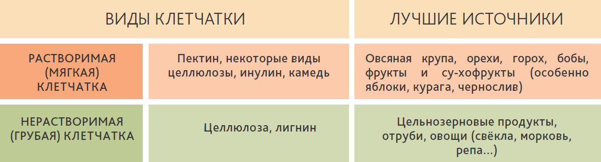 Клетчатка не разрушается пищеварительной системой и не всасывается в кишечнике. В нашем организме не существует даже фермента, способного её расщепить, а значит, она не переваривается и не имеет никакой энергетической ценности. К тому же клетчатка не содержит ни витаминов, ни минералов. Поэтому очень долго её считали абсолютно бесполезной. Но оказалось, что без клетчатки человек не может жить. Поскольку именно благодаря ей пищу получают кишечные бифидо и лактобактерии, от которых во многом зависит иммунитет, работа желудочно-кишечного тракта и здоровье в целом А ещё она как щётка для кишечника, проходя по пищеварительной системе, способствует лучшему усвоению всей остальной пищи. Адсорбируя и выводя при этом вредные для организма вещества. Клетчатка – это неперевариваемые углеводы растительного происхождения, которые делятся на два вида: растворимые и нерастворимые. Растворимые – это пектин из овощей и фруктов, некоторые виды целлюлозы из злаков, инулин, камедь и слизь из круп. Нерастворимая клетчатка – это прежде всего целлюлоза и лигнин, а также некоторые виды гемицеллюлозы из оболочек растительных клеток. Растворимая и нерастворимая клетчатка нужна нам одинаково, хотя и действует по-разному. Растворимая клетчатка впитывает и выводит из организма холестерин и желчные кислоты, защищает слизистую желудка и кишечника от механических повреждений. Нерастворимая обеспечивает объём пищевого комка и более продолжительное чувство сытости.