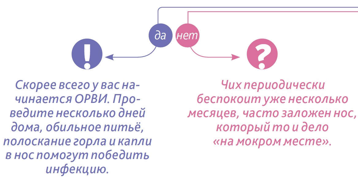 Банальная ОРВИ тоже нередко начинается с частого чихания. Если для гриппа больше характерны подъём температуры, ломота в мышцах и кашель, то респираторные инфекции почти всегда начинаются с размножения вирусов в носоглотке, а значит, оказывают на слизистую сильное раздражающее действие. Спутники ОРЗ – заложенный нос, боль в горле, температура около 38оС – знакомы каждому, и если всё идёт по плану, чих отступит через 3–4 дня. Ускорить процесс помогает своевременная очистка носа, использование капель, в том числе сосудосуживающих. Но помните, к ним развивается привыкание, поэтому лучше не применять их чаще 2 раз в день и не больше 4 дней подряд.