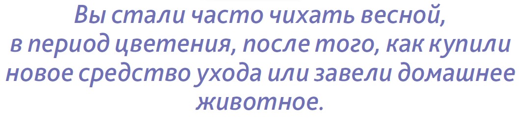 Одна из самых частых причин частого чихания – аллергия. Сезонная, связанная с цветением трав и деревьев или вызванная покупкой нового шампуня, порошка, крема или косметики. Признаки общей аллергической реакции: обильное слёзо- и слизетечение, раздражение слизистой носа, першение в горле. Глаза краснеют, а на коже могут появиться высыпания по типу крапивницы. В тяжёлых случаях может присоединиться отёк лица и шеи, ощущение нехватки воздуха, удушье. И, конечно, нас постоянно тянет чихнуть.