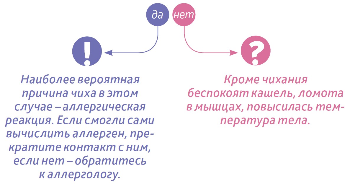 Прежде всего важно постараться вычислить аллерген. Под подозрение попадают любые новые химические средства, косметика, которой раньше не пользовались, недавно приобретённые домашние животные. Если удалось вычислить провокатора и прекратить общение, вскоре вы перестанете чихать. Если же симптомов респираторного заболевания и температуры нет, а чих мучает по-прежнему, без консультации аллерголога не обойтись.