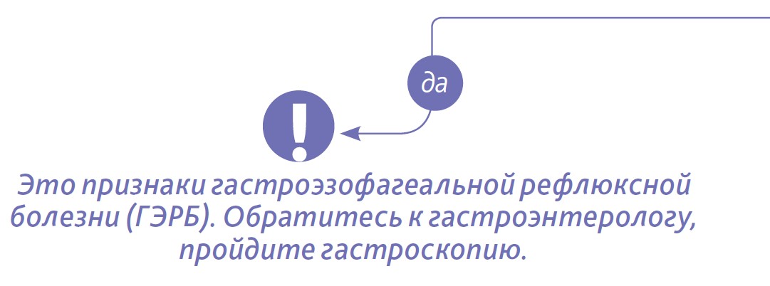 Самый точный метод диагностики ГЭРБ – гастроскопия. Характерное воспаление слизистой пищевода и недостаточность кардии (место перехода пищевода в желудок) укажут на частый заброс кислоты. Когда диагноз установлен, потребуется изменить рацион питания, не есть за 2 часа до сна, купить специальную подушку, чтобы спать полусидя, и начать курсовой приём лекарств из группы блокаторов протонной помпы. В наши дни раз и навсегда помогает лапароскопическая операция, которая особенно эффективна, если причиной заброса кислоты является грыжа пищеводного отверстия диафрагмы.