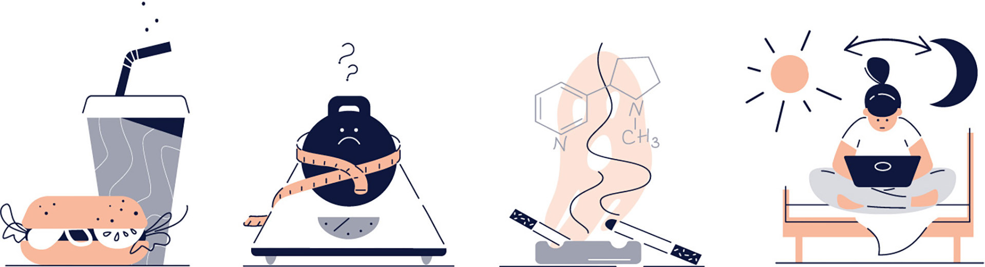Есть исследования, которые показывают, что курение приводит к нарушениям сна, а нарушения сна – к набору веса и увеличению объёма висцерального жира. Почему это происходит? Во многом из-за изменения секреции гормонов аппетита и насыщения: у людей повышается аппетит, и они начинают больше есть, часто в вечернее и ночное время. Еда занимает всё больше времени, а калории накапливаются вместе с жиром. В дополнение к этому сокращение продолжительности сна активирует гедонистические центры в головном мозге, изменяется активность нейронов, которые повышают восприимчивость к пищевым стимулам.