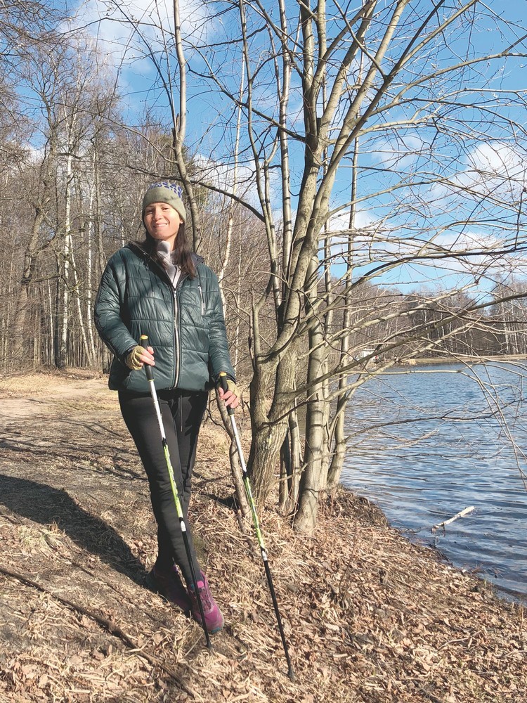 КАК? Скандинавская ходьба – это легко и удобно. Заниматься можно рядом с домом – в парке, в лесу, на улицах. Достаточно купить удобную обувь и палки. Я думала: что тут сложного, иди себе и иди. Но не всё получается с первого раза, тут много нюансов в движениях и дыхании, от которых зависит эффективность тренировки. Чтобы работали все группы мышц, а не только ноги, нужна правильная техника. Когда занимаешься в группе, тренировка проходит весело. Во время индивидуальных занятий с инструктором лучше корректировать технику, выбирая новые маршруты со спусками и подъёмами. Когда я тренируюсь одна, то это своего рода медитация – мозг отдыхает от информационного шума, освобождается от лишних мыслей, мой эмоциональный фон выравнивается, что очень важно для мамы маленьких детей. Удобно заниматься в условиях ограниченного времени: я отвожу детей на кружки, а сама хожу вокруг озера. Палки и кроссовки у меня всегда в машине. Тренировка идёт два с лишним часа, при этом меня не пугают ни дождь, ни снег – в любую погоду заниматься здорово!