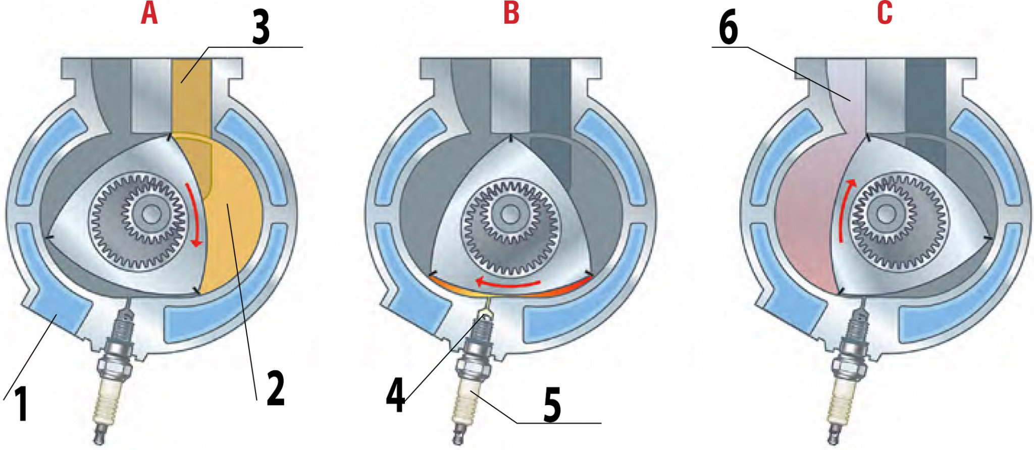 В роторно-поршневом двигателе все несколько по-иному. Внешне ротор напоминает треугольник с выпуклыми сторонами (он, собственно, по-другому и называется треугольником Рело), вращается в полости корпуса (его еще именуют статором, картером или просто секцией) на эксцентрическом валу. Внутри ротора происходит весь рабочий цикл – пуск, сжатие, воспламенение, рабочий ход, выпуск. Цикл такой же, как и поршневом двигателе, однако на этом сходство и заканчивается. Потому что в роторнопоршневом моторе никаких цилиндров нет: все такты происходят в камере, которая постоянно меняет объем благодаря неподвижным стенкам корпуса, постоянно соприкасающимся с вершинами движущегося ротора.