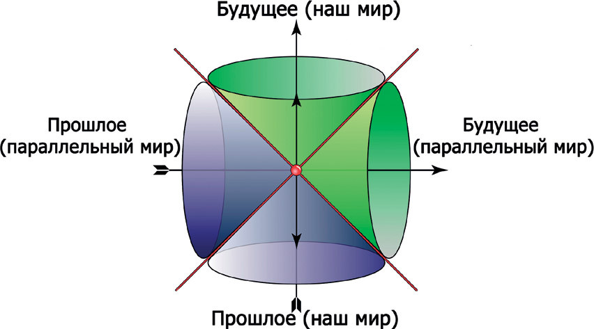 Два вертикальных конуса – это наша Вселенная, а перпендикулярные ей конусы – это параллельная вселенная, аналогичная нашей. Согласно метрике финслерова пространства, световые конусы нашей и параллельной вселенных имеют точки соприкосновения. В этих точках объекты каждой из вселенных движутся со скоростью света. В случае же если в нашем и параллельном мире взять два неподвижных объекта, то их скорость относительно друг друга будет составлять 90 000 000 000 км/с. Это скорость света в квадрате, полученная автором теории относительности Альбертом Эйнштейном. И это та скорость, при которой любой объект любой массы полностью превращается в энергию. Скорость света в квадрате является наибольшей возможной скоростью, если рассматривать движение объектов между параллельными пространствами. Иными словами, чтобы попасть в параллельное пространство, скорость объекта должна лежать между скоростью света (299 792 км/с) и скоростью света в квадрате (90 000 000 000 км/с).