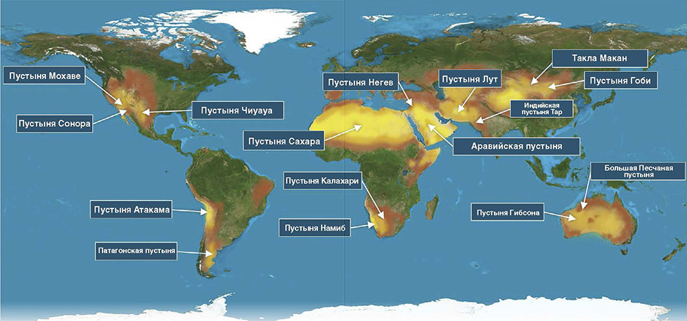 На карте мира действительно на всех континентах видны пустыни, как специально вытянувшиеся на двух основных линиях. Одна из них проходит через 30 градус северной широты (тропики) и начинается с запада Африки – пустыня Сахара, проходя через нее до западной окраины континента и далее уходит на Аравийский полуостров (Аравийская пустыня), пустыни Средней Азии, Такла Макан и Гоби и пропадает в конце Евразии. А уже через Тихий океан снова возникает на западе Северной Америки – пустыни Мохаве, Сонора и Чиуауа и более мелкие. Вторая линия пустынь проходит через 30 градус южной широты и начинается на юге Африки – пустыни Намиб и Калахари – и, минуя Индийский океан, появляется в Австралии (Большая песчаная пустыня), которая занимает до 44% континента. Пропадает линия в Тихом океане и далее появляется на западе Южной Америки – пустыни Атакама и Патагонская.