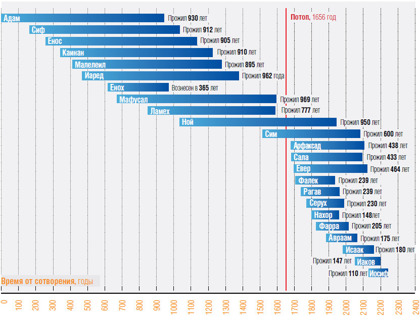 Для начала откроем Библию и посмотрим, сколько лет жили ее герои. Адам дожил до 930 лет. Его сын Сиф чуть уступил отцу – 912 лет, внук Енос – 905, а правнук Каинан – 910. Его сын Малелеил дожил до 895, а его наследник Иаред – до 962. старец Мафусаил, правнук Адама, побил все рекорды, покинув сей мир в возрасте 969 лет. При этом Мафусаилу принадлежит еще одно достижение – он оказался самым пожилым отцом, родив сына Ламеха (777 лет жизни) в свои 187. На внуке Мафусаила – Ное (950 лет) – рекорды долгожительства людского племени закончились.