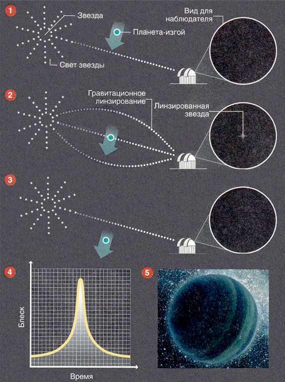 Когда планета проходит перед далекой звездой, ее гравитация фокусирует звездный свет, подобно линзе, вызывая возрастание блеска звезды. Вскоре планета проходит дальше, и блеск звезды возвращается к исходной величине. Нарисовав зависимость блеска звезды от времени, астрономы могут вычислить массу и размеры объекта, вызвавшего линзирование. Таким способом группа под руководством астрофизика Такахиро Суми с помощью телескопа MOA-II обнаружила 10 объектов, которые по массам и размерам сравнимы с Юпитером. При этом не было признаков наличия у этих планет звезд.