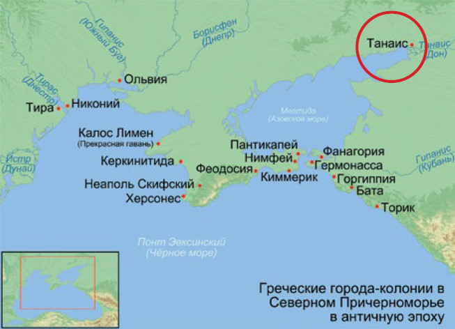 Карта греческих колоний в античную эпоху. Мы видим на ней город Танаис