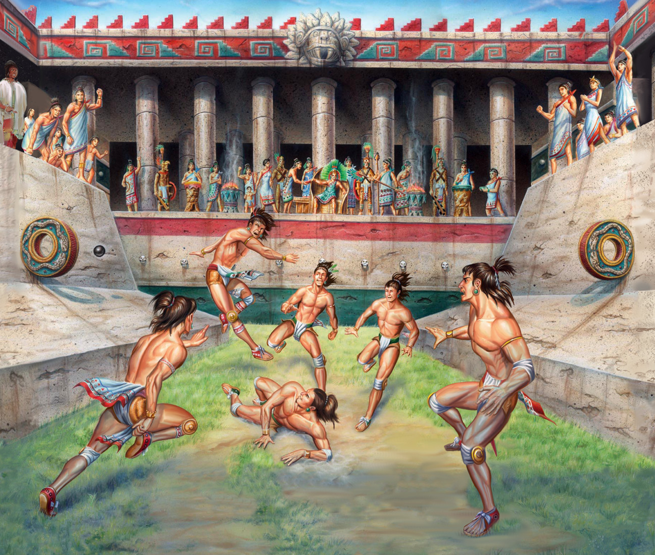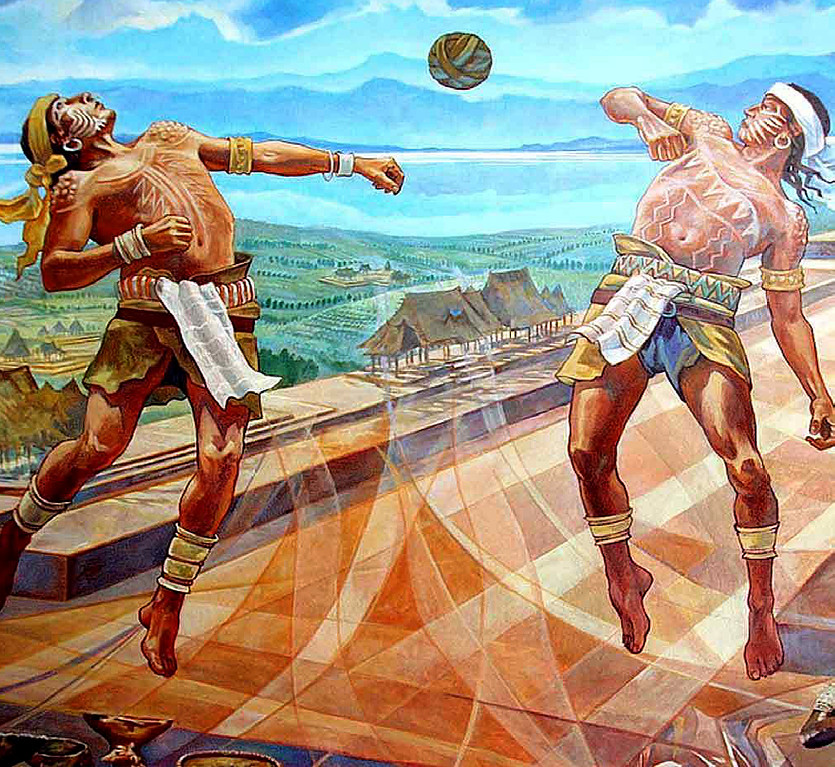 Эта игра имела множество форм и названий – например, тлачтли, или, на языке ацтеков, – олламалистли, или, на языке майя, – пок-та-пок. Возникла она, вероятно, еще до 1400 года до н.э. в тропических зонах, где произрастает каучуковое дерево, то есть на территории современных мексиканских штатов Веракрус и Табаско. Почему? – скоро узнаем. Интересно, что в подобие тлачтли – уламу – и сегодня играют в мексиканском штате Синалоа, даже проводят соревнования, на которые съезжаются команды со всей страны. Конечно, сейчас это просто молодежное развлечение. В древности же спортивная игра была наполнена сакральной символикой, имела ритуальные, магические, социально-политические функции. В зависимости от времени, места и многих других факторов различались и характеристики игры. Так что можно даже сказать, что это была целая группа схожих игр, различавшихся правилами, размерами мяча, конфигурацией игровых площадок (стадионов) и экипировкой. Практически все данные, которыми на сегодняшний день располагает наука относительно этой игры (или группы игр), почерпнуты из мифологии, росписей, барельефов и статуэток, обнаруживаемых во время раскопок. И крайне мало информации содержится в письменных источниках.