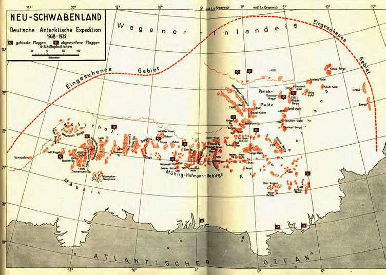 Открытый русскими мореплавателями в ХIХ веке шестой материк по площади превышает размеры Европы. Более века он оставался неприступным из-за высоких, иногда до нескольких десятков метров, ледяных берегов. И вот вдруг Германия проявляет столь повышенный интерес к этому, казалось бы, бесполезному загадочному континенту. На его исследования Рейх выделяет фантастически огромные суммы! Так, еще за два года до начала Второй мировой туда отправляются авианосцы, самолеты которых доставляют вымпелы, таким образом закрепляя за собой территорию, равную самой Германии, и дают ей название Новая Швабия. В 1939 году командир экспедиции рапортует: «Я выполнил миссию, возложенную на меня маршалом Герингом. Впервые германские самолеты пролетели над антарктическим континентом. Каждые 25 км наши самолеты сбрасывали вымпелы. Мы покрыли зону приблизительно в 600 тысяч квадратных километров».