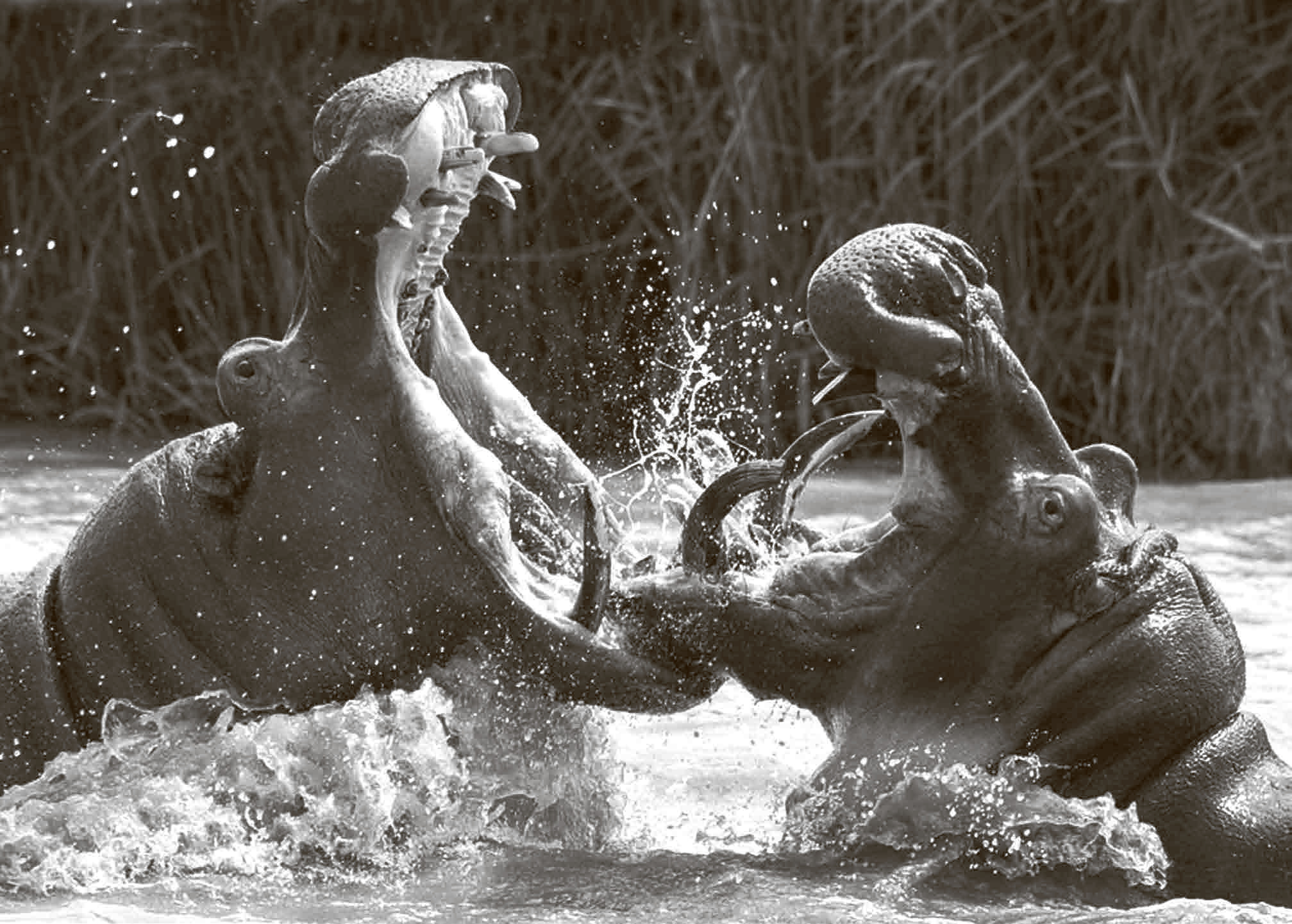 Один из гигантов, вынырнув наверх, поднял над водою голову и, распахнув огромную, как пещера, пасть, помотал ею из стороны в сторону. Мелькнули большие, как оглобли, клыки, торчащие наружу. Ими бегемоты перелопачивают озерное или речное дно, рвут водоросли или корни деревьев, используют для угроз в схватках между собой и обороны от хищников. У всех взрослых самцов шкура покрыта «узором» боевых шрамов и заживших ран после схваток друг с другом. Издав короткий рык, великан, захлопнув с «чмаканием» свою пасть-чемодан, ушел под воду на глубину, оставив после себя крутящиеся буруны.