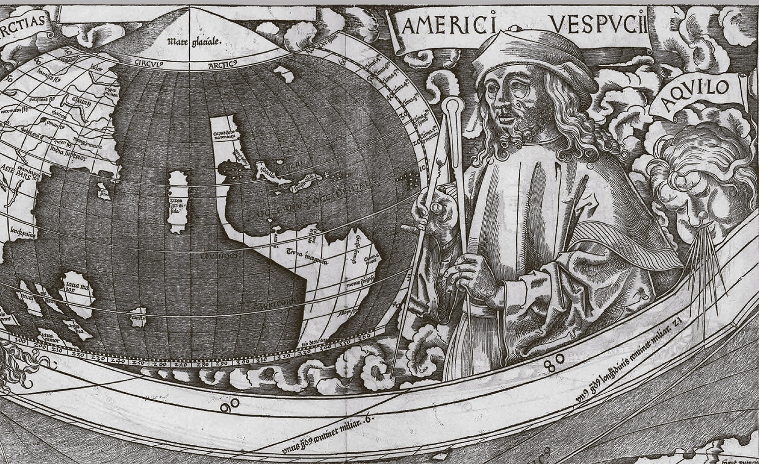 Над картой Вальдземюллер изобразил два полушария. Рядом со «Старым Светом» был помещен портрет Клавдия Птолемея, который в своем «Руководстве по географии» в восьми книгах описал всю известную тогда ойкумену – Европу, Африку и Азию. Рядом с «Новым Светом» красовался портрет Америго Веспуччи.